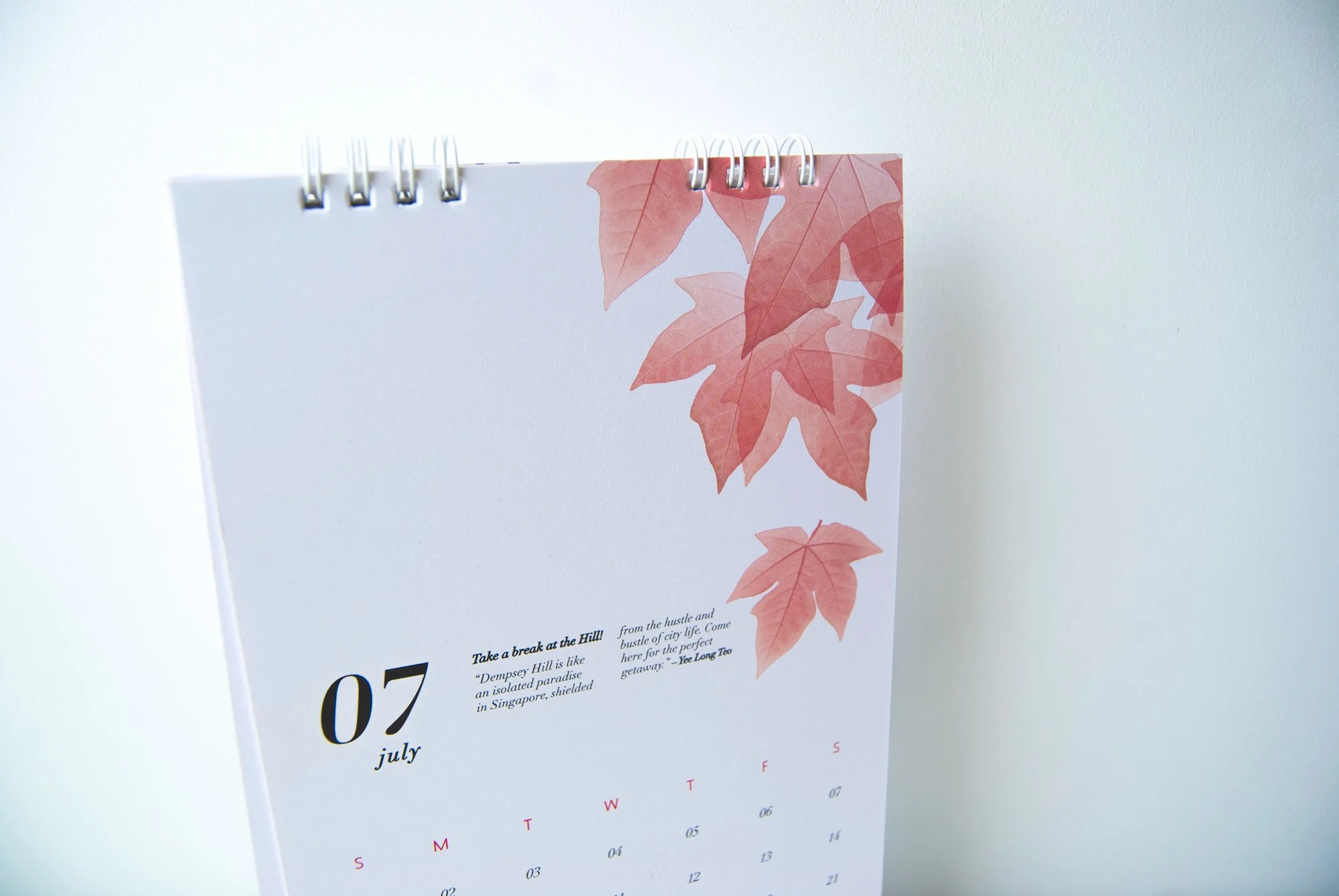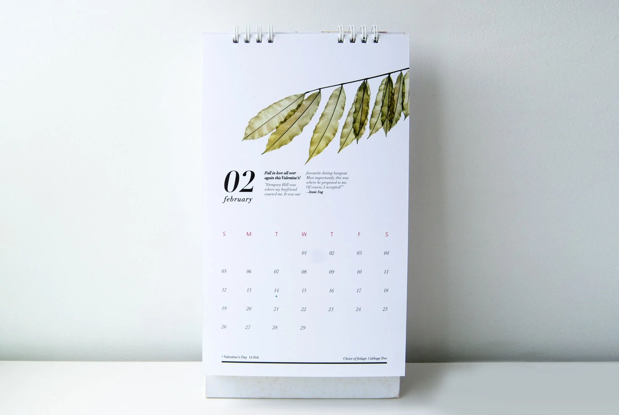 There is something about calendars that stir and inspire you for the days ahead and beyond. Watch the seasons change with Dempsey Hill's 2012 Calendar with leaves found and photographed around the quaint hill, seeking to acquaint and beckon one with the best the place has to offer. Skip-wire-o binding and pearl hot-stamping are small details that add on to an understated feel.
